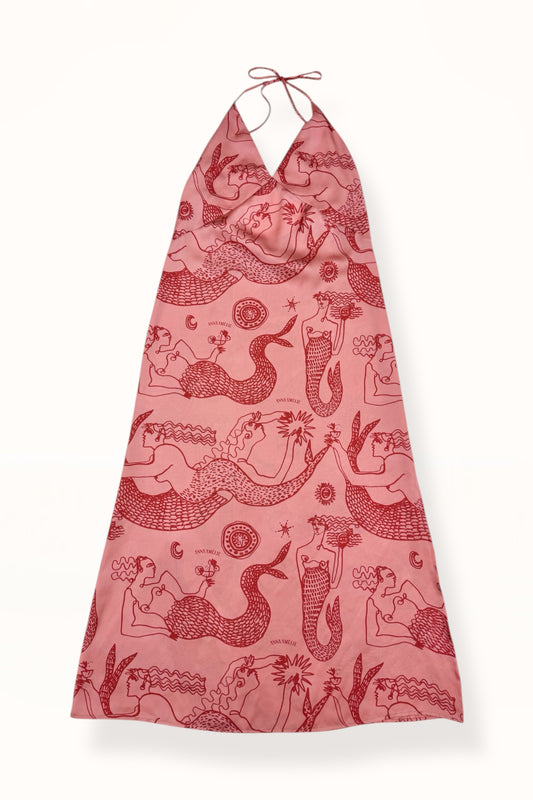 HALTER NECK DRESS w. SCARF - MERMAID PRINT | PINK & RED