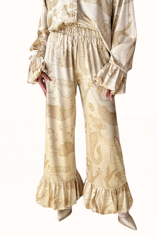BUBBLE HEM SATIN PANTS - "MERMAIDS PRINT" | GOLDEN