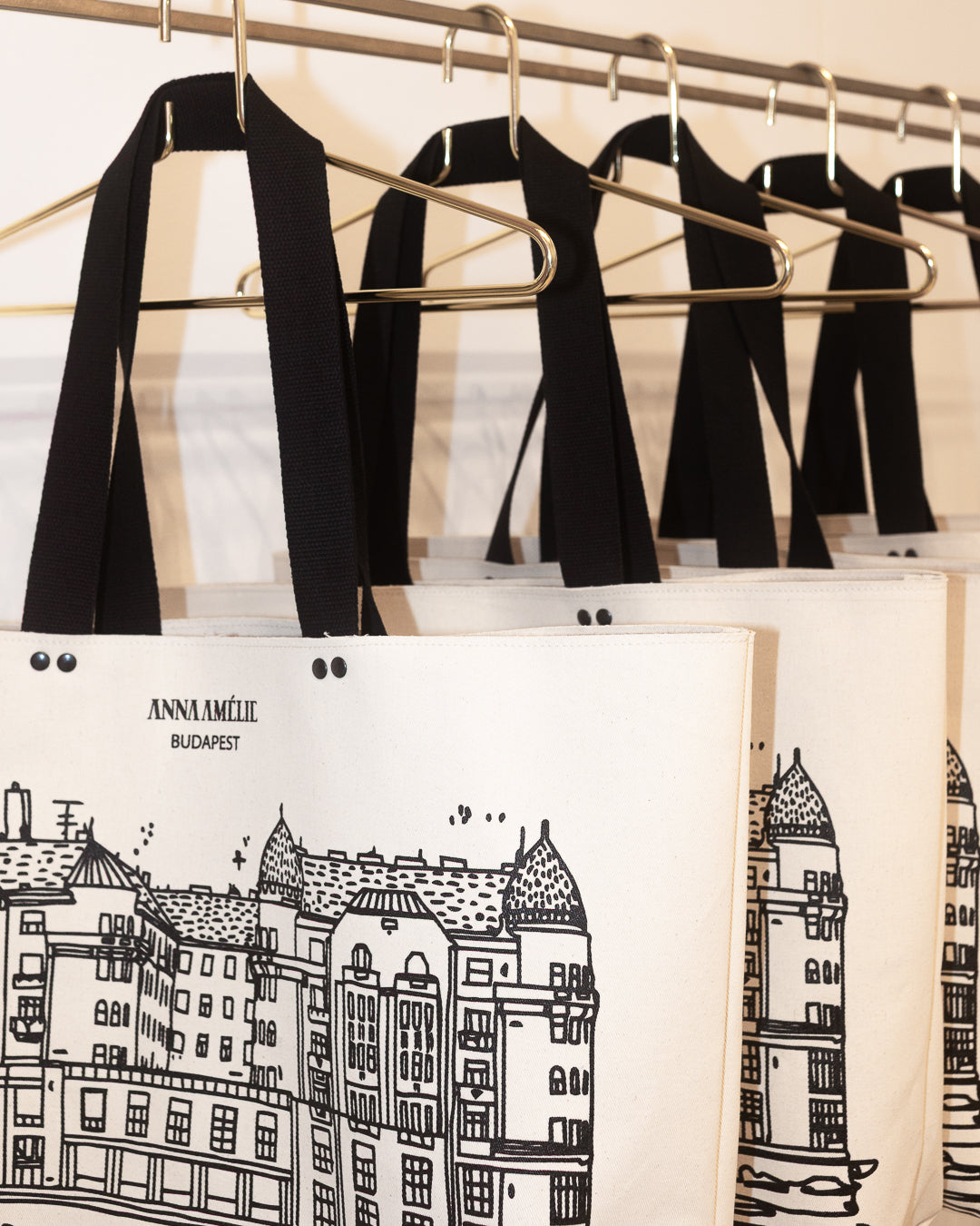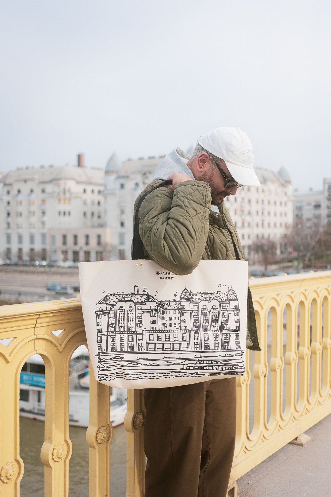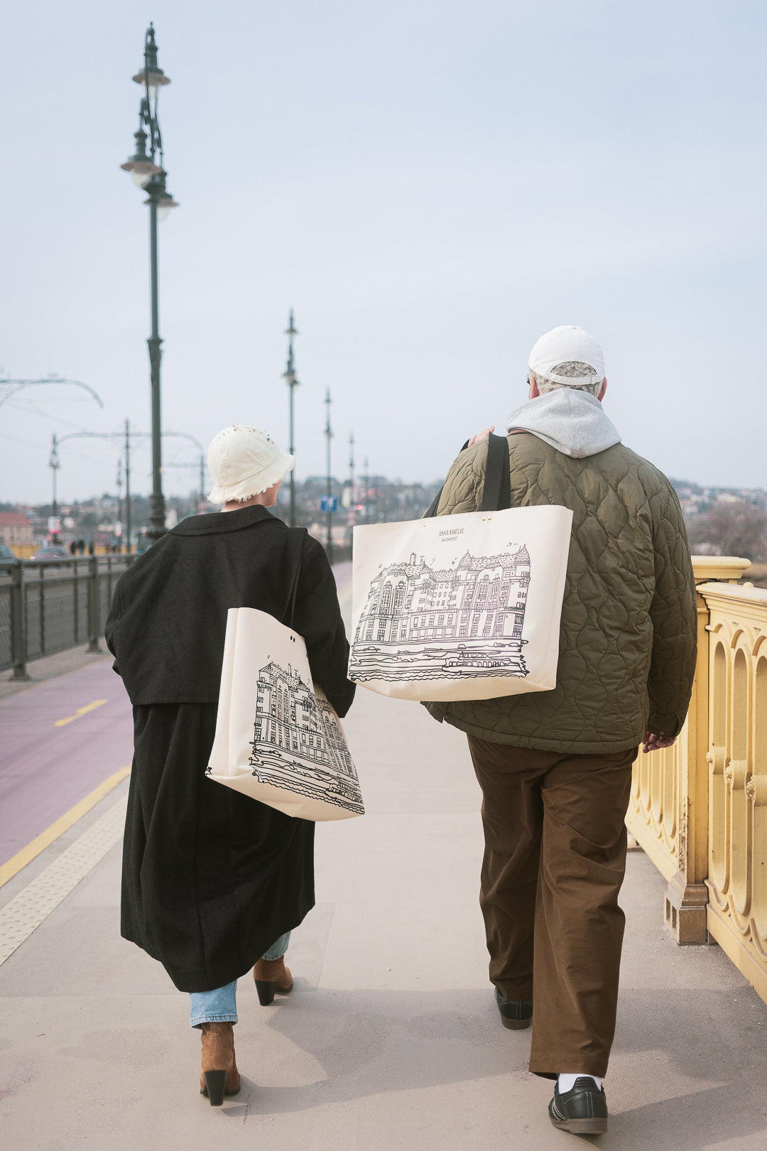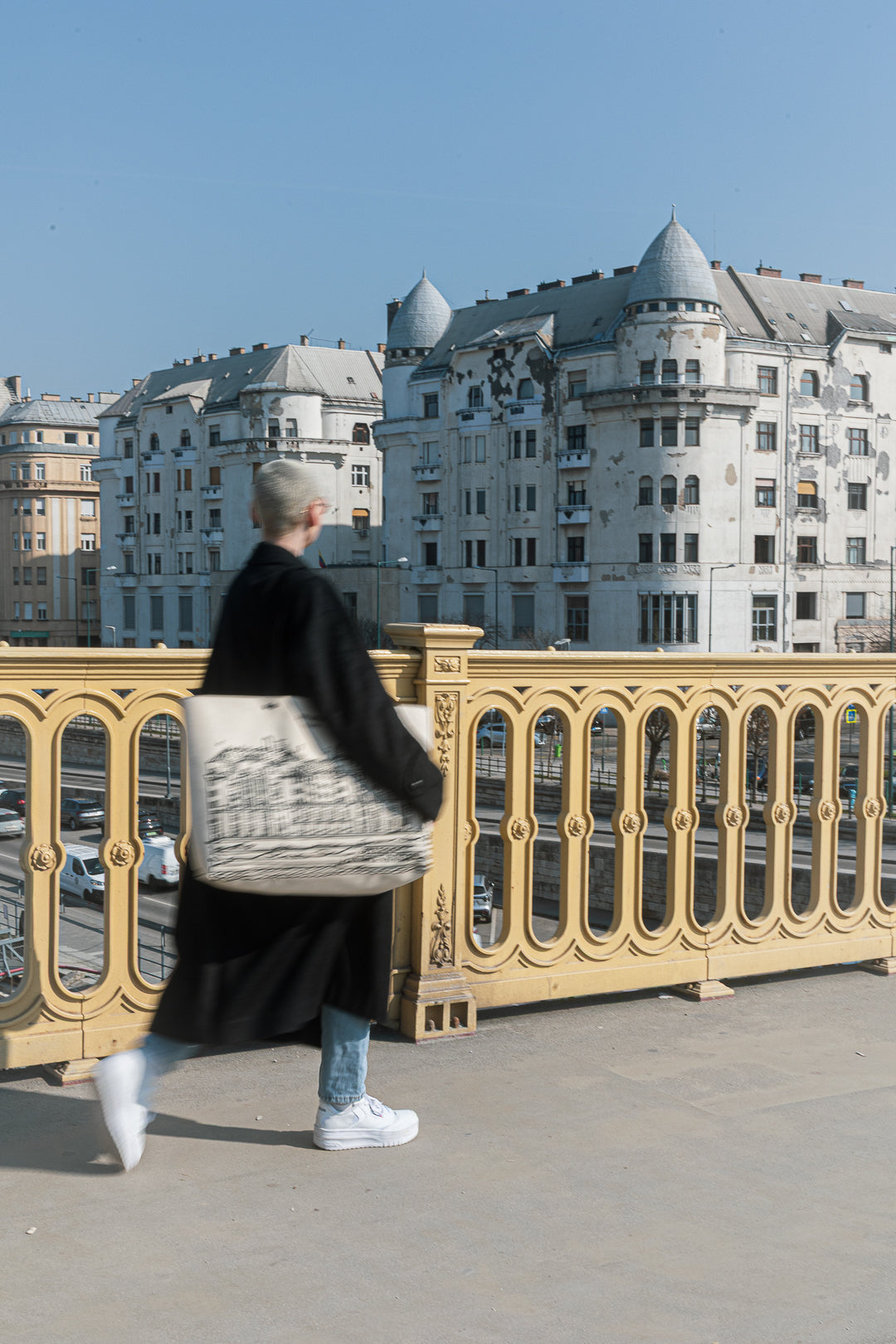 The illustration on the bag features the distinctive silhouette of the Palatinus-ház, standing proudly at the Pest side of the Margit híd. Built in the early 1910s, the Palatinus House is one of those buildings that quietly shape the visual identity of Budapest.